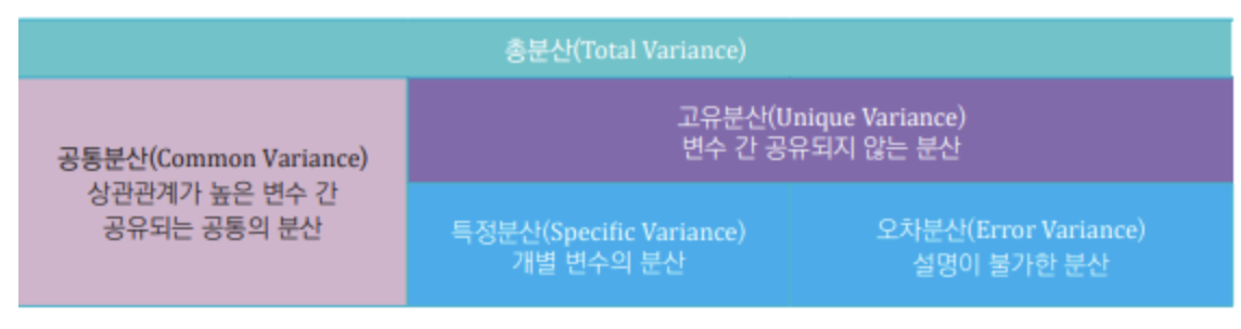 이와 달리 요인분석에서는 고유분산을 이용한다. 예를 들어 국어, 영어, 수학 점수를 통해 '언어 능력'을 측정한다는 가정에서, 각 점수에 영향을 끼친 고유한 원인을 찾는 과정이 요인분석이다. 각 변수마다 독립적인 특성을 확인해야 하므로 고유분산을 사용한다.