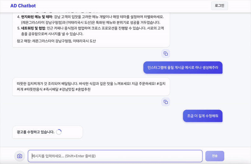 | 주요 기능 | 이미지 기반 약품 인식 | Retriever, 문서 검색, 응답 생성 | 광고 문구 생성, 상담 챗봇, 시나리오 분기 |