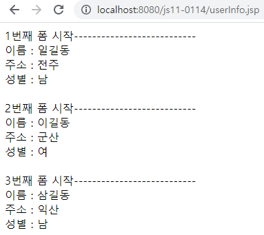 out.println("<br>주소 : "+ userAddrArray[i]);